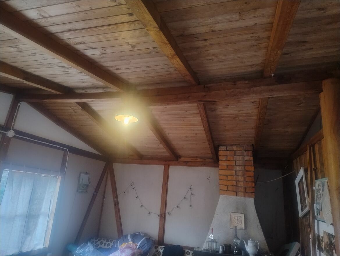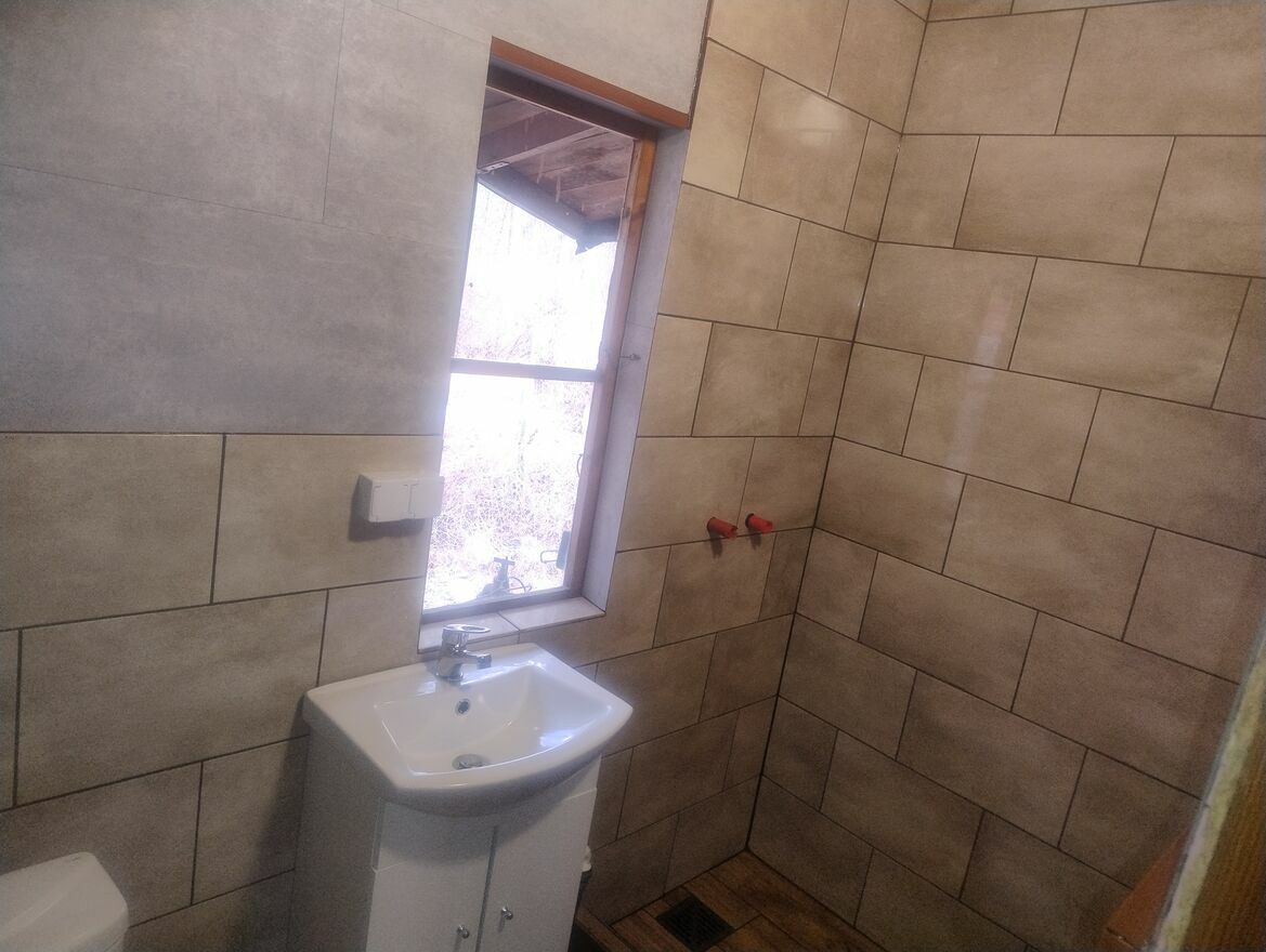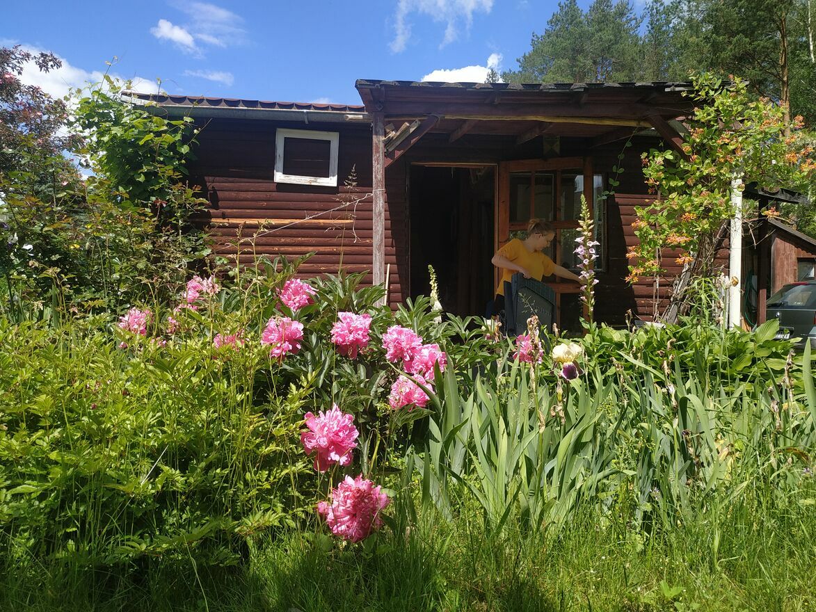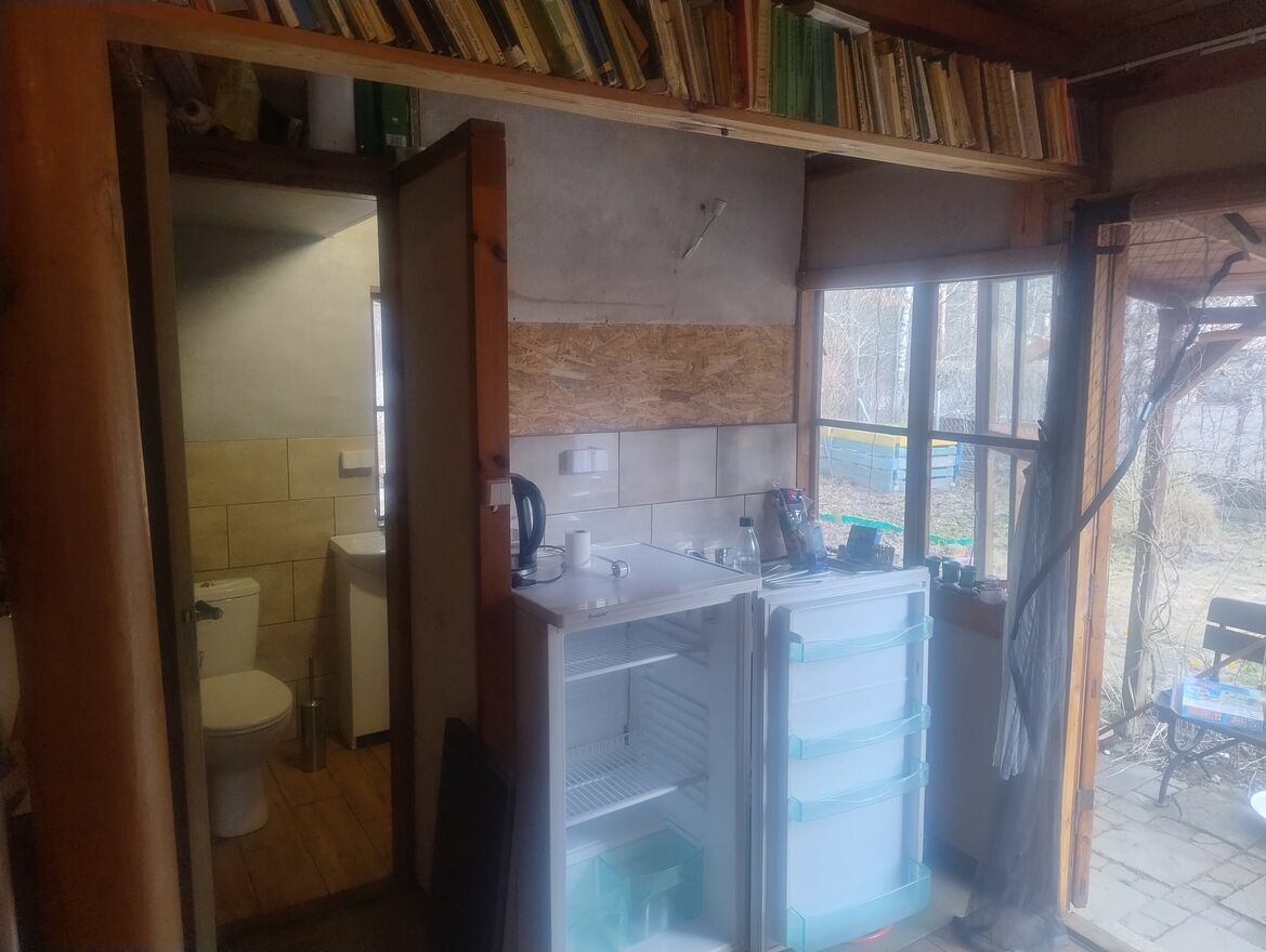 Na działce znajduje się drewniany domek, w którym jest: